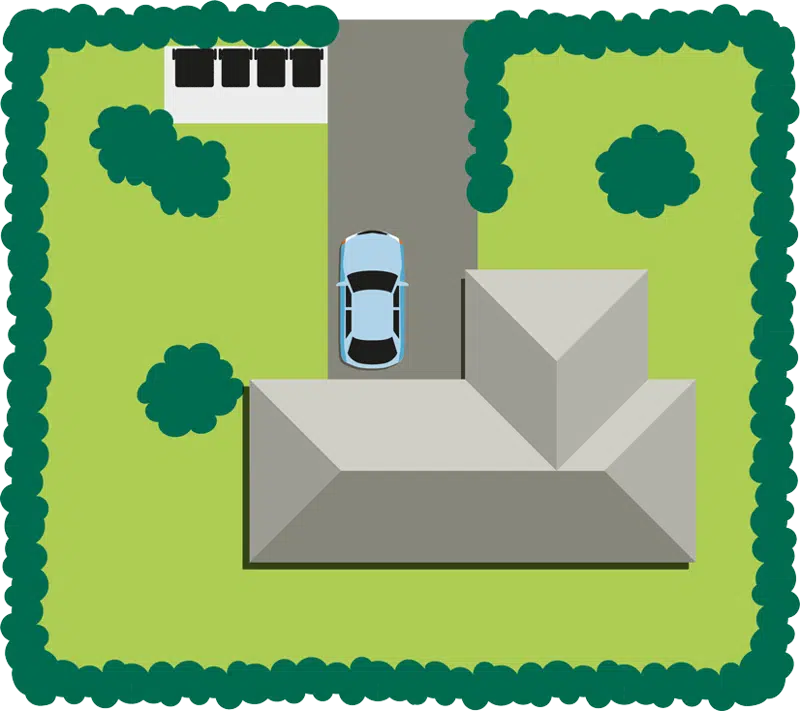 Billedet viser et eksempel på en almindelig husgrund med en standplads indenfor 8 meter fra skellet. Affaldsbeholderne vil blive hentet ved standpladsen og sat tilbage, når de er tømt.