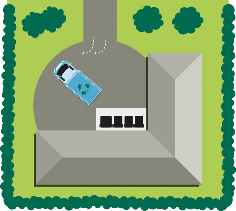 Billedet viser, hvordan skraldebilen skal kunne holde tæt på, hvor du har beholderne stående.